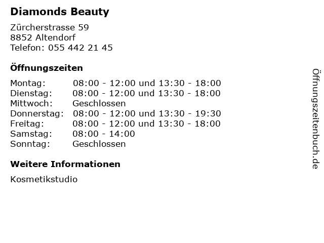 | Öffnungszeiten Diamonds Beauty in Altendorf anzeigen | |