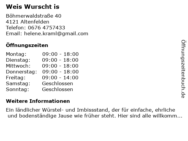 | Öffnungszeiten Weis Wurscht is in Altenfelden anzeigen | |