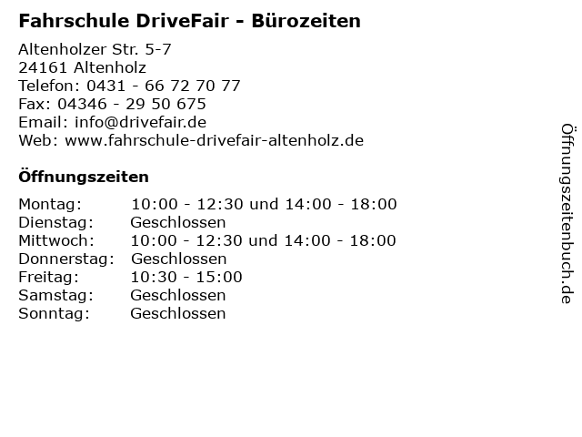 Branchen & Suchbegriffe zu Fahrschule DriveFair - Bürozeiten:auto, bürozeiten, drivefair, fahrlehrer, fahrschule, fahrunterricht, lernen, mofa, moped, motorrad, schulung, unterricht |