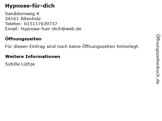 | Öffnungszeiten Hypnose-für-dich in Altenholz anzeigen | |