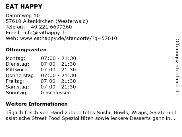 | Öffnungszeiten EAT HAPPY in Altenkirchen (Westerwald) anzeigen | |