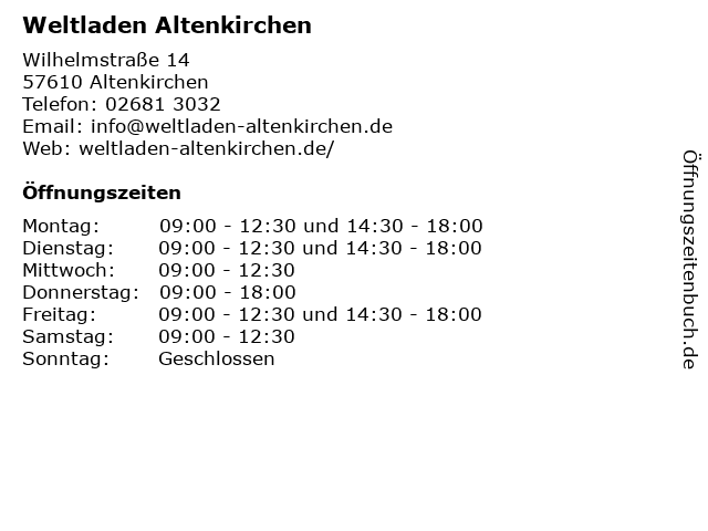 | Öffnungszeiten Weltladen Altenkirchen in Altenkirchen anzeigen | |