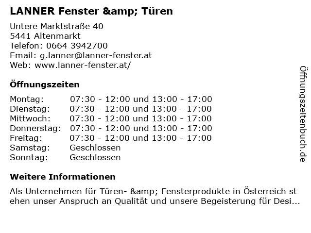 | Öffnungszeiten LANNER Fenster & Türen in Altenmarkt anzeigen | |