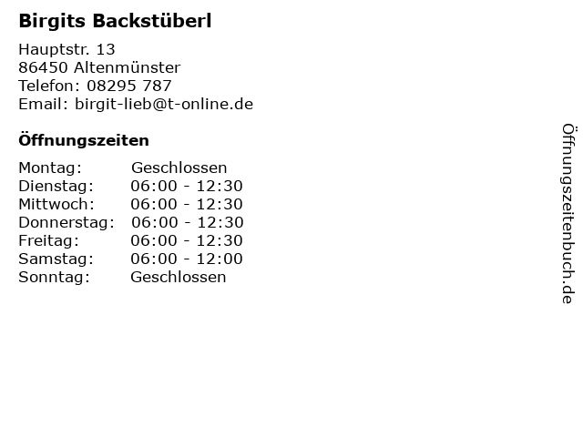 | Öffnungszeiten Birgits Backstüberl in Altenmünster anzeigen | |