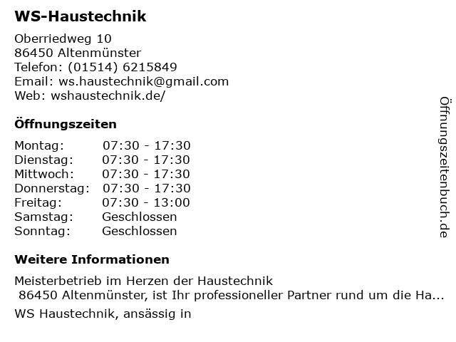 Öffnungszeiten WS-Haustechnik in Altenmünster anzeigen | |