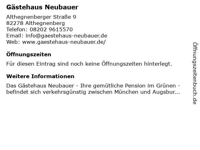 | Öffnungszeiten Gästehaus Neubauer in Althegnenberg anzeigen | |