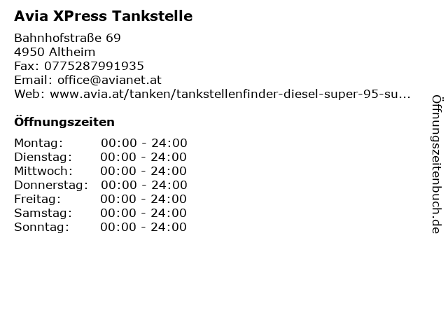 | Öffnungszeiten Avia XPress Tankstelle in Altheim anzeigen | |