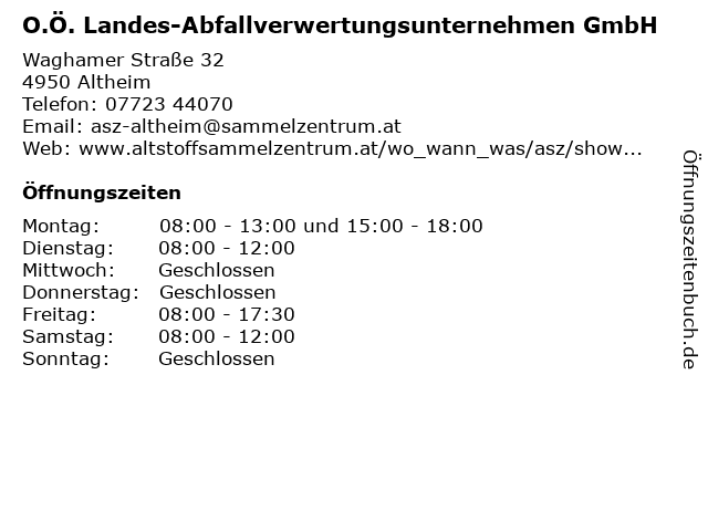 Branchen & Suchbegriffe zu O.Ö. Landes-Abfallverwertungsunternehmen GmbH:abfallverwertungsunternehmen, altheim, asz, bezirksabfallverband, braunau, entsorgung, landes, müll, o.ö., sammelzentrum |