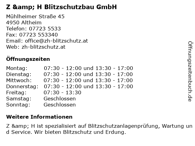 | Öffnungszeiten Z & H Blitzschutzbau GmbH in Altheim anzeigen | |