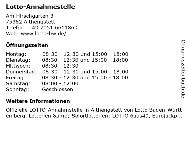 | Öffnungszeiten Lotto-Annahmestelle in Althengstett anzeigen | |
