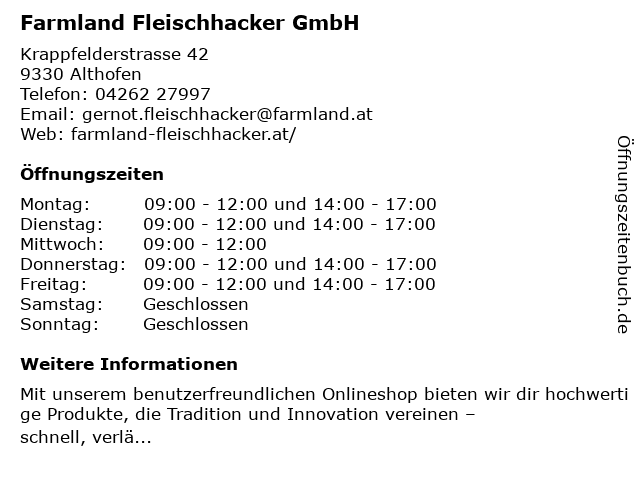 | Öffnungszeiten Farmland Fleischhacker GmbH in Althofen anzeigen | |