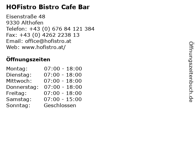 | Öffnungszeiten HOFistro Bistro Cafe Bar in Althofen anzeigen | |