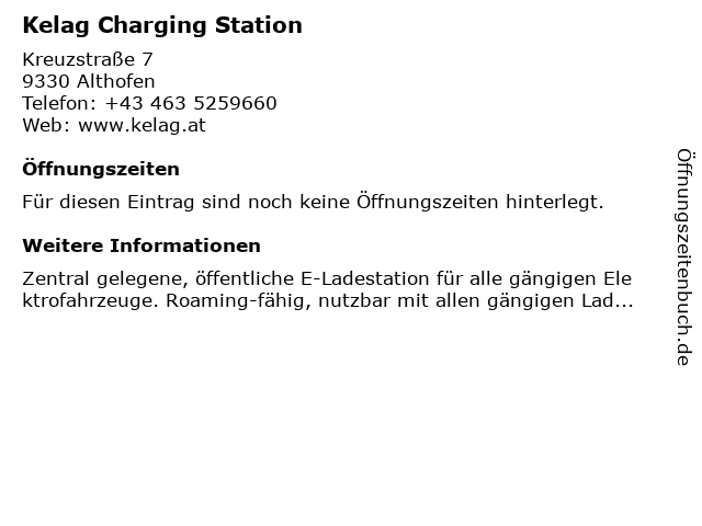 | Öffnungszeiten Kelag Charging Station in Althofen anzeigen | |
