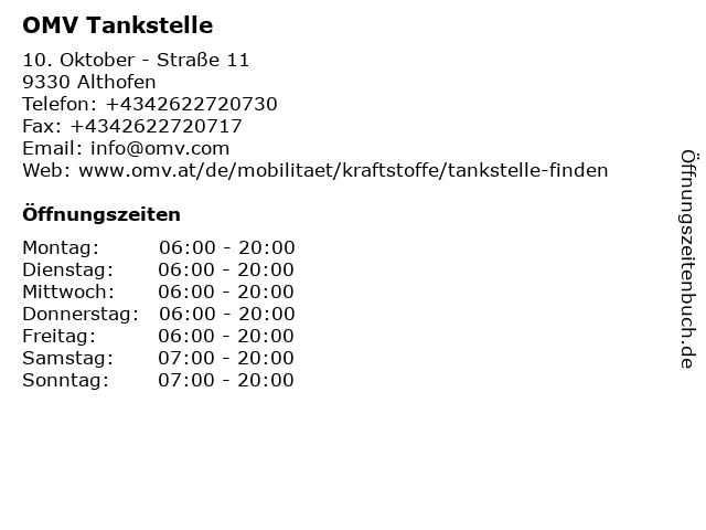 | Öffnungszeiten OMV Tankstelle in Althofen anzeigen | |