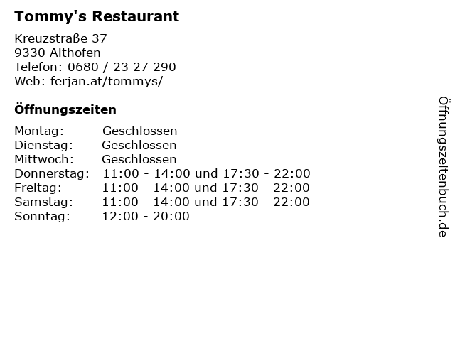 | Öffnungszeiten Tommy's Restaurant in Althofen anzeigen | |