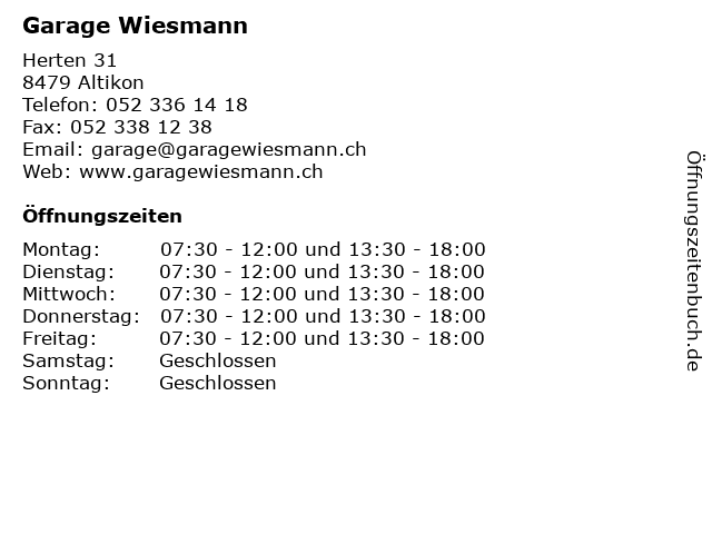 | Öffnungszeiten Garage Wiesmann in Altikon anzeigen | |
