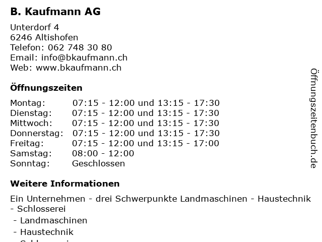 | Öffnungszeiten B. Kaufmann AG in Altishofen anzeigen | |