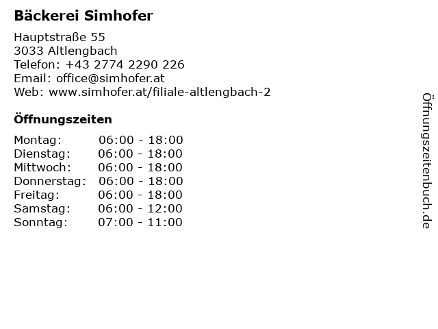 | Öffnungszeiten Bäckerei Simhofer in Altlengbach anzeigen | |