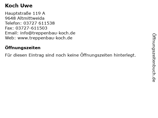 | Öffnungszeiten Koch Uwe in Altmittweida anzeigen | |