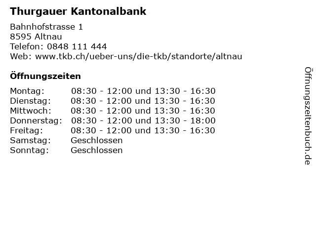 | Öffnungszeiten Thurgauer Kantonalbank in Altnau anzeigen | |