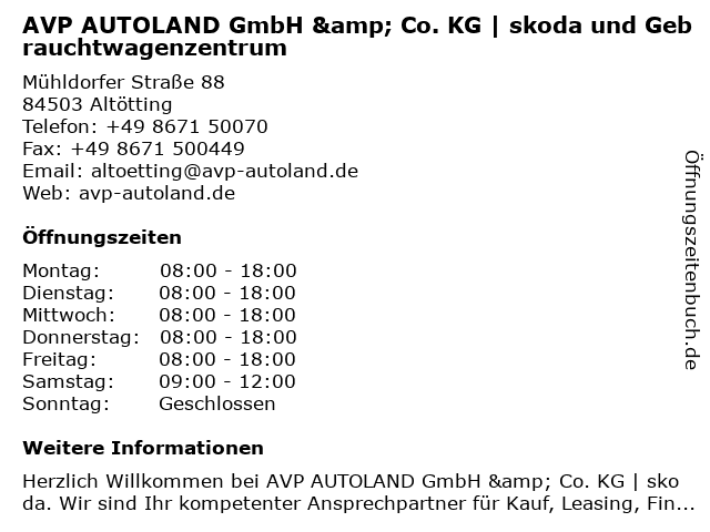 1 AVP Akoda Autohaus GmbH & Co. KG / Service (Entfernung: 0,02 km) Mühldorfer Straße 88, 84503 Altötting 6 |