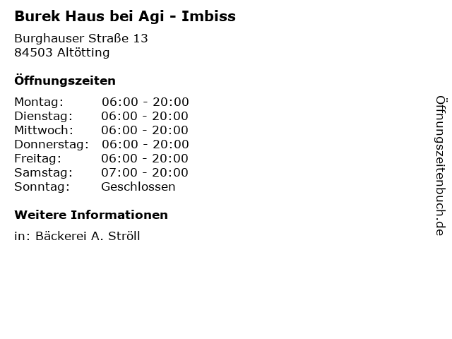 | Öffnungszeiten Burek Haus bei Agi - Imbiss in Altötting anzeigen | |