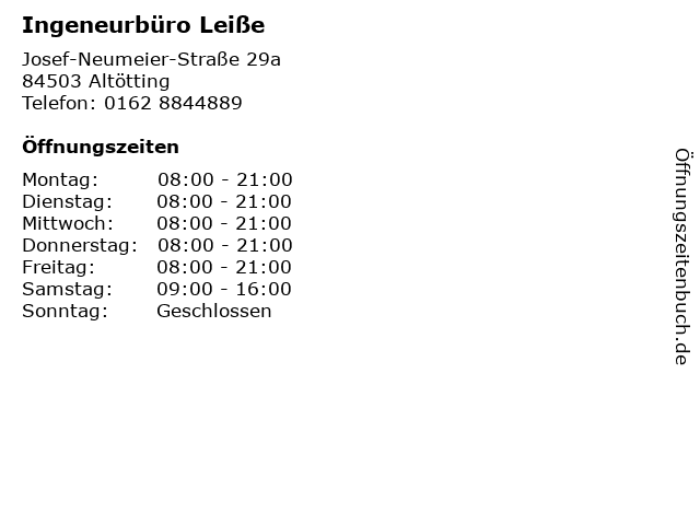 | Öffnungszeiten Ingeneurbüro Leiße in Altötting anzeigen | |