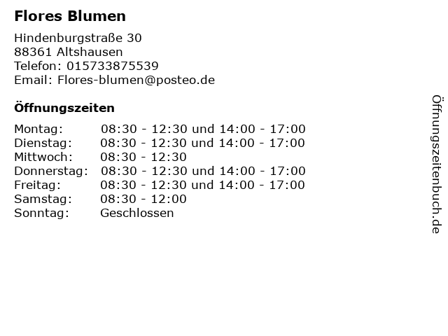 | Öffnungszeiten Flores Blumen in Altshausen anzeigen | |