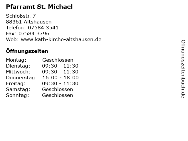 | Öffnungszeiten Pfarramt St. Michael in Altshausen anzeigen | |