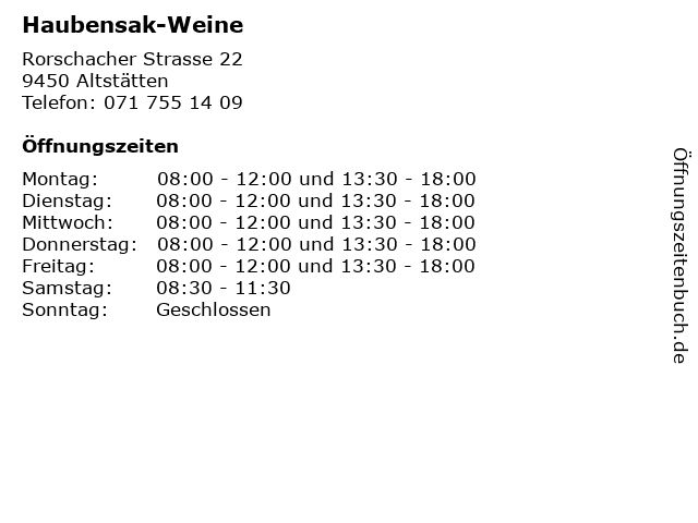 | Öffnungszeiten Haubensak-Weine in Altstätten anzeigen | |