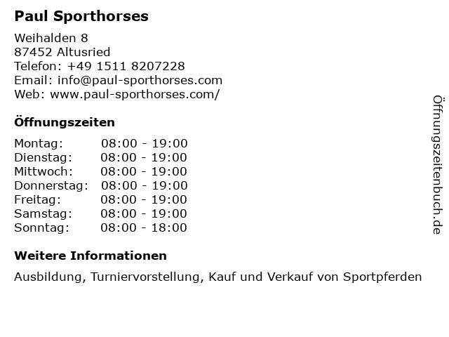 | Öffnungszeiten Paul Sporthorses in Altusried anzeigen | |