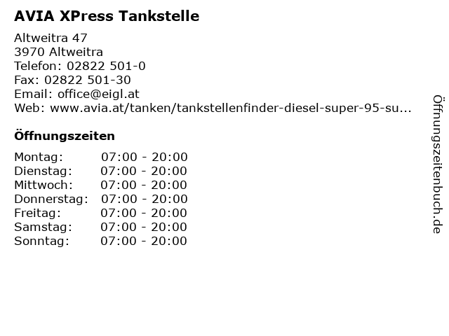 | Öffnungszeiten AVIA XPress Tankstelle in Altweitra anzeigen | |