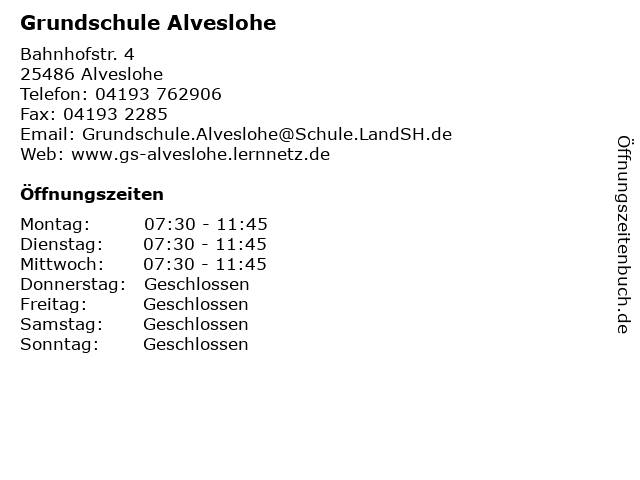 | Öffnungszeiten Grundschule Alveslohe in Alveslohe anzeigen | |