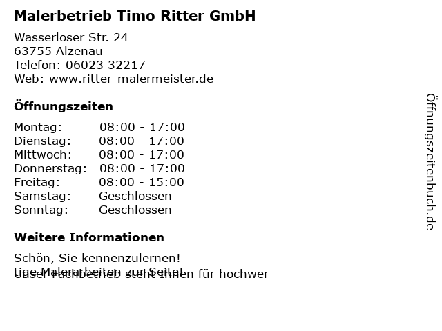 | Öffnungszeiten Malerbetrieb Timo Ritter GmbH in Alzenau anzeigen | |