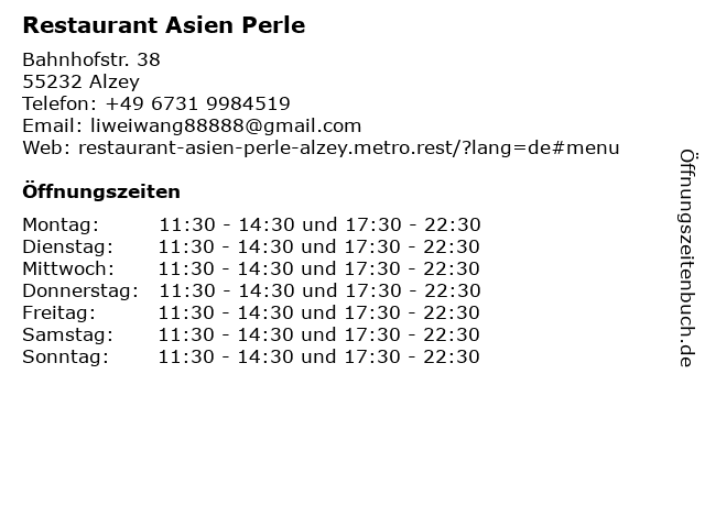 | Öffnungszeiten Restaurant Asien Perle in Alzey anzeigen | |
