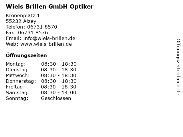 | Öffnungszeiten Wiels Brillen GmbH Optiker in Alzey anzeigen | |