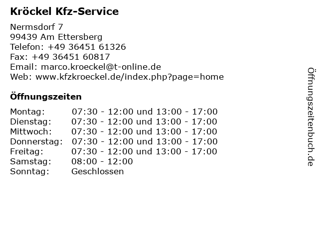 | Öffnungszeiten Kröckel Kfz-Service in Am Ettersberg anzeigen | |