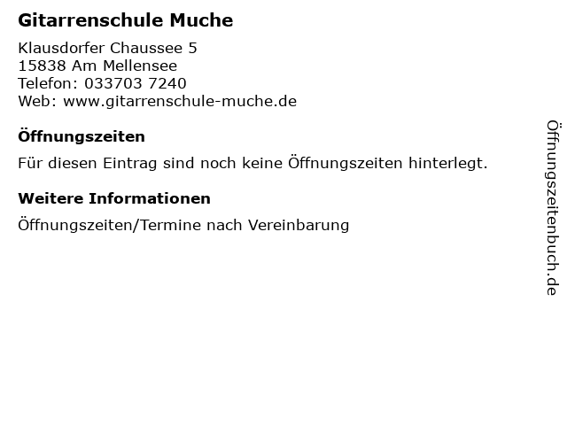 | Öffnungszeiten Gitarrenschule Muche in Am Mellensee anzeigen | |