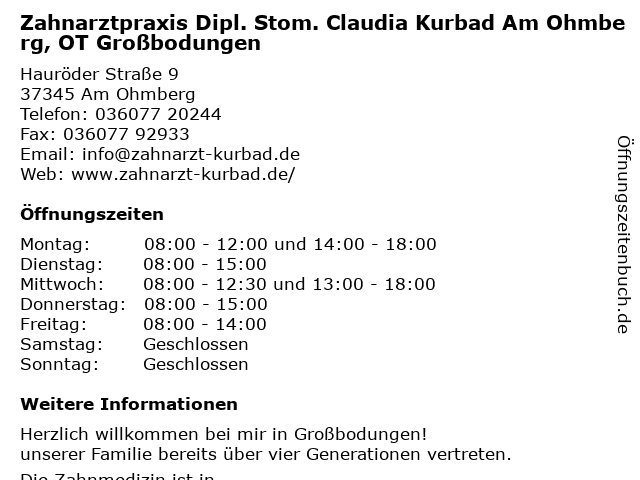 Branchen & Suchbegriffe zu Zahnarztpraxis Dipl. Stom. Claudia Kurbad Am Ohmberg, OT Großbodungen:claudia, dipl., großbodungen, kurbad, ohmberg, ot, stom., zahnarztpraxis |