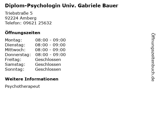 3 Praxis für Psychologische Psychotherapie - Ph Dr./Univ. Prag Hana Nemecek (Entfernung: 0,61 km) Kleinheinzstraße 4, 92224 Amberg 6 |