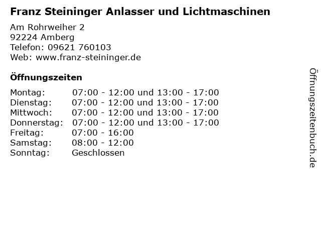 1 Breuer OHG Handel für Anlasser und Lichtmaschinen aller Art (Entfernung: 5,25 km) Siebeneichener Straße 4-6, 92284 Poppenricht 2 Manfred Steininger Sachverständiger f. Gebäudeschäden u. Grundstückbewertung (Entfernung: 5,37 km) Lindenstr. 17, 92245 Kümmersbruck 4 Glockner Josef , Elisabeth Anlasser- u. Lichtmaschinenservice (Entfernung: 38,77 km) An der Breite 9, 93182 Duggendorf 5 Steininger Vorrichtungs- und Sondermaschinenbau GmbH & Co KG (Entfernung: 38,83 km) Oberer Riedweg 3, 90518 Altdorf 6 |