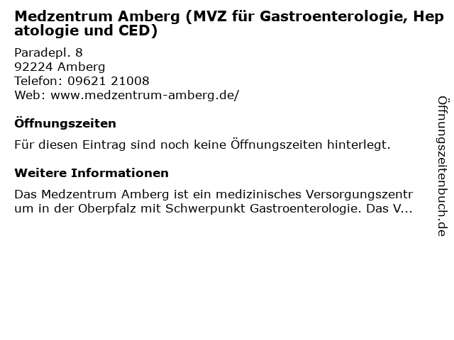 | Medzentrum Amberg (MVZ für Gastroenterologie, Hepatologie und CED) anrufen | |