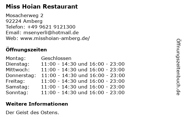 | Öffnungszeiten Miss Hoian Restaurant in Amberg anzeigen | |