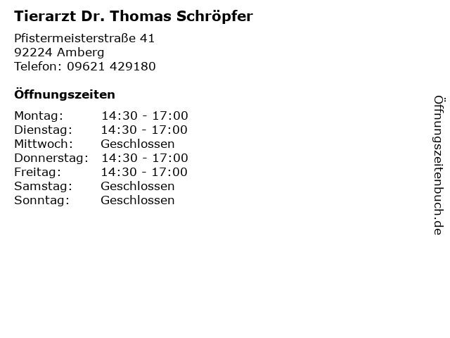 | Öffnungszeiten Tierarzt Dr. Thomas Schröpfer in Amberg anzeigen | |