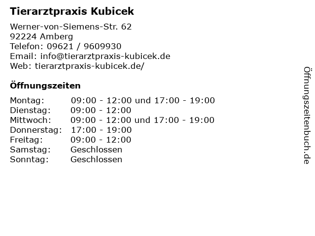 | Öffnungszeiten Tierarztpraxis Kubicek in Amberg anzeigen | |