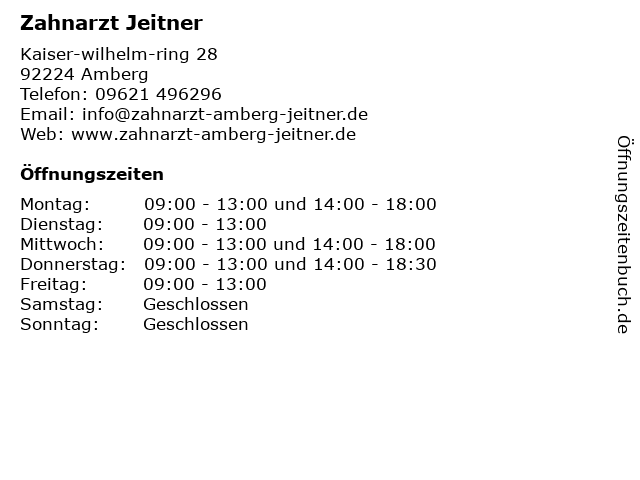| Öffnungszeiten Zahnarzt Jeitner in Amberg anzeigen | |