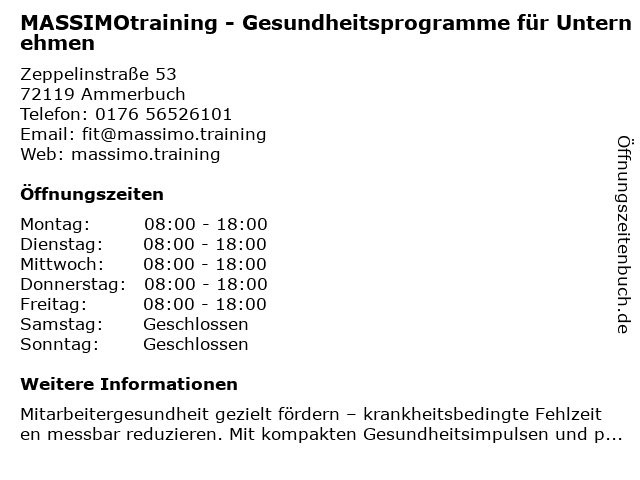 Branchen & Suchbegriffe zu MASSIMOtraining - Gesundheitsprogramme für Unternehmen:abnehmklinik, allgemeinärzte, fitnessstudio, gesundheitsprogramme, massimotraining, personal trainer, physiotherapie, unternehmen |