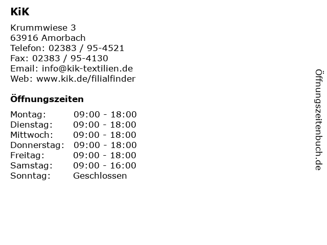 | Öffnungszeiten KiK in Amorbach anzeigen | |