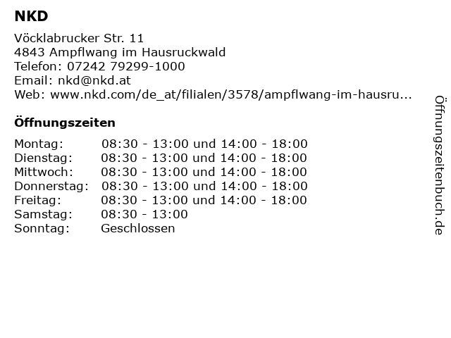 | Öffnungszeiten NKD in Ampflwang im Hausruckwald anzeigen | |