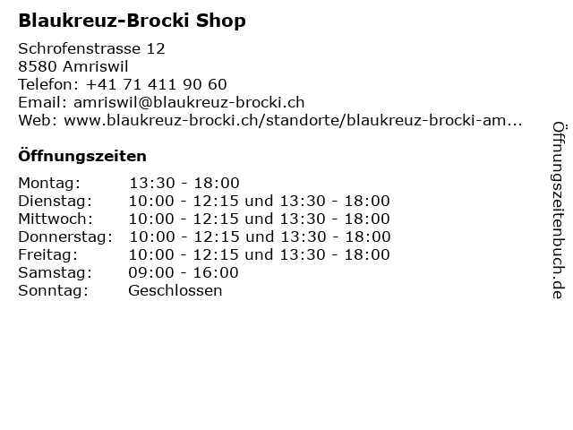 | Öffnungszeiten Blaukreuz-Brocki Shop in Amriswil anzeigen | |